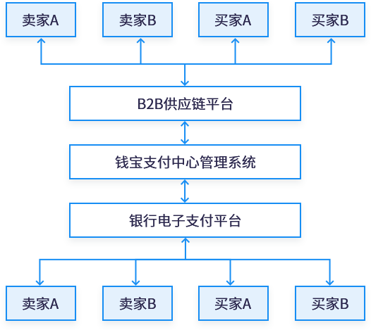 钱包支付中心分别与“B2B平台”和“银行电子支付平台”联调对接