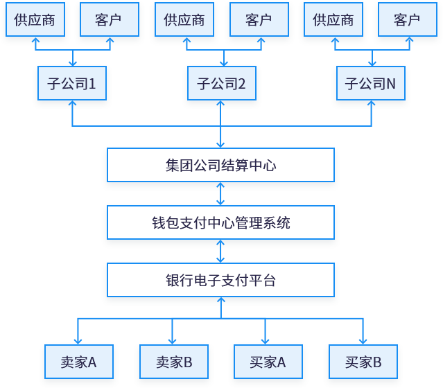 子公司与供应商/客户的直接支付 / 各子公司的资金自动归集到“集团公司”的“平台账户” / 各子公司实现内部“资金调拨”